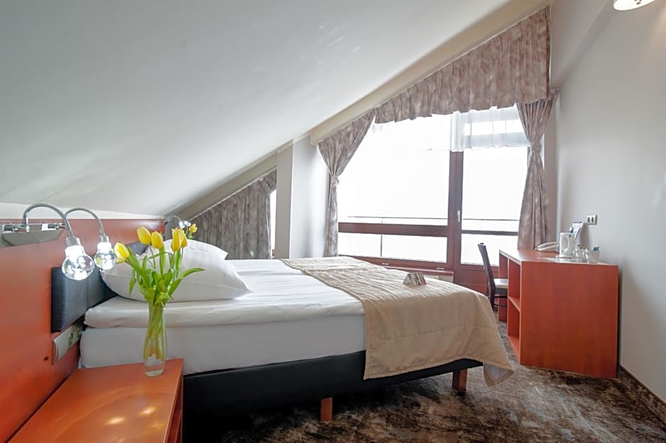 Well-arranged, classically decorated room with a work desk and a bathroom with a shower. Some rooms have a balcony offering the mountain view.