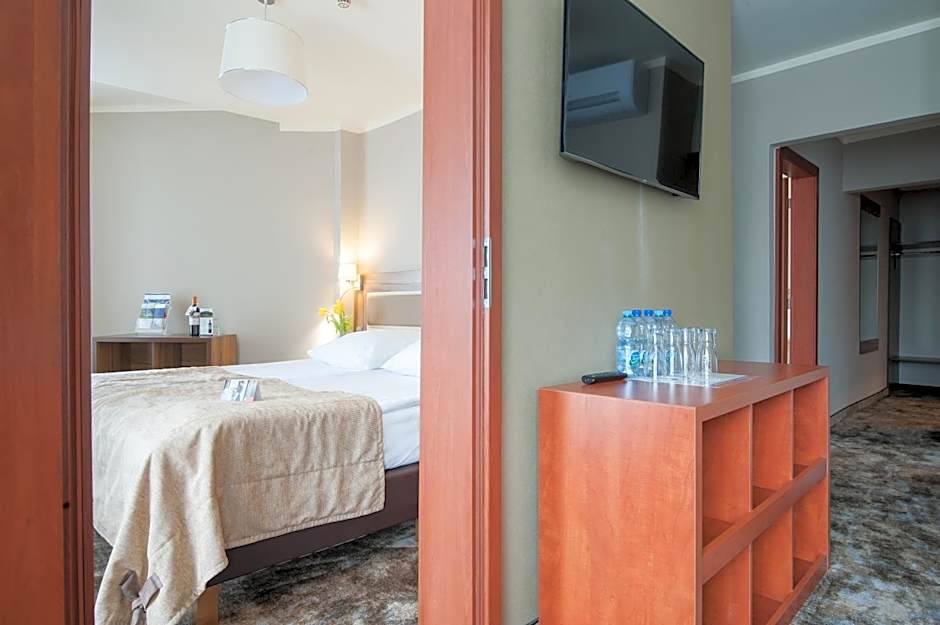 This room features a balcony with panoramic views of the Beskidy Mountains. There is a work desk and a bathroom with a shower. Available configurations of the apartment: